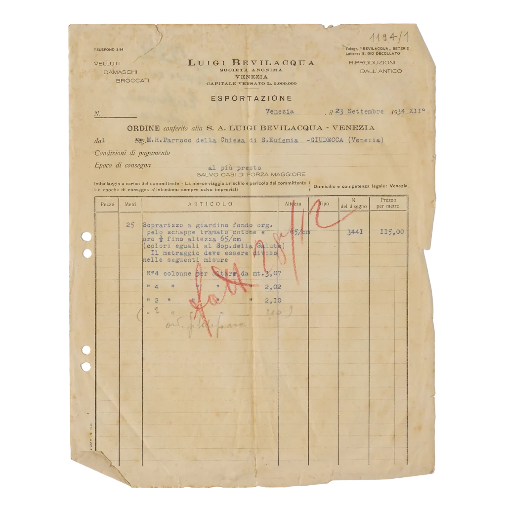 Ordine di velluto soprarizzo organza Orofino (Basilica della Salute) per la Chiesa di S. Eufemia di Venezia.