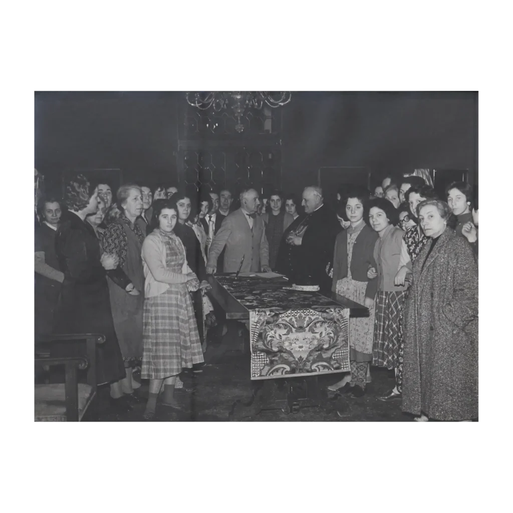 Fotografia del velluto "Colonne Salute" mentre viene mostrato al cardinale Roncalli, patriarca di Venezia
