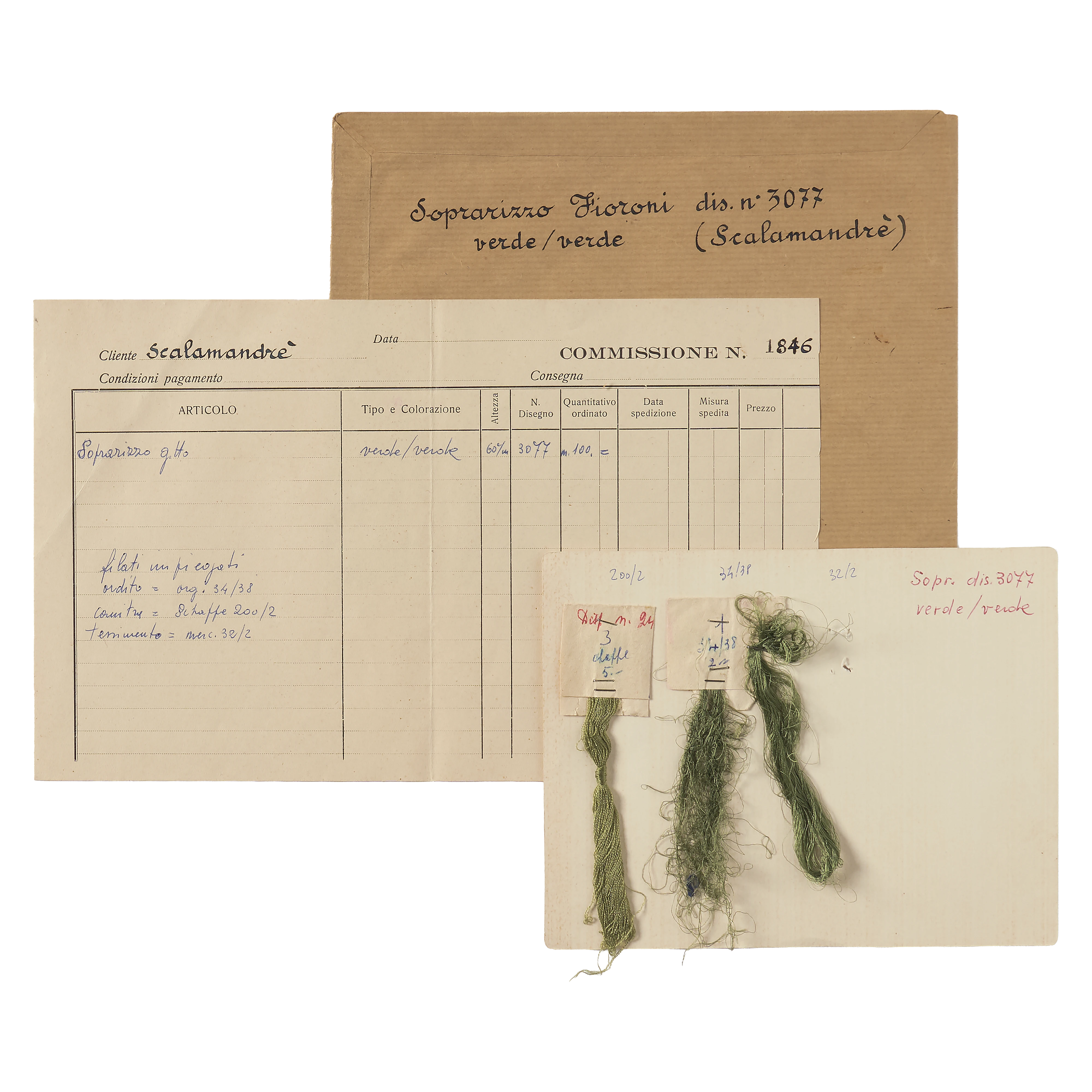 The bundle contains a small bag with samples of thread and soprarizzo velvet Fioroni design 3077, ordered from Scalamandré