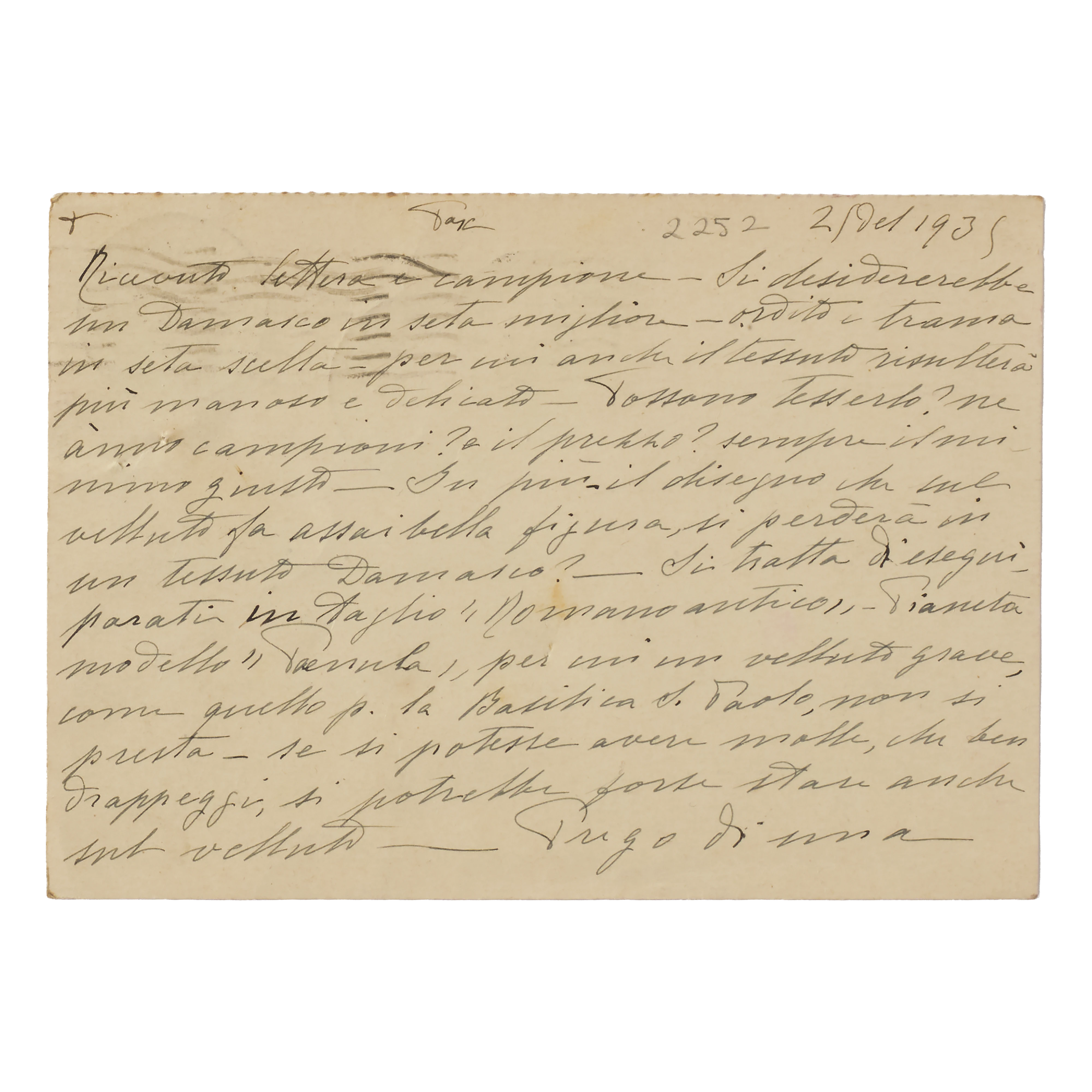 Correspondence relating to the preparation of soprarizzo velvet 3459 for the Monastery, with sketches of the requested design. The velvet will take its historical name from this commission