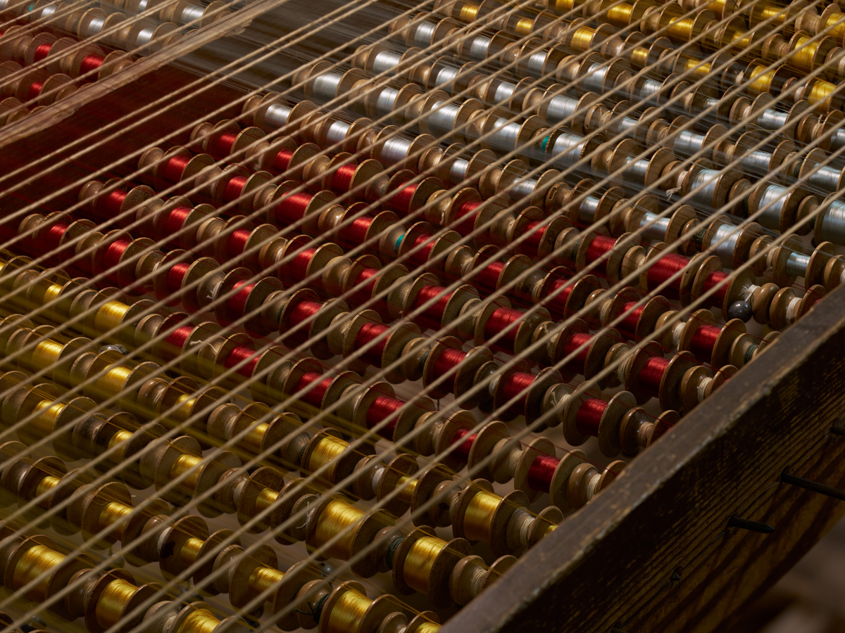 Below the taut warp threads is the creel, a wooden frame with the thread bobbins (which can be 400, 800 or 1600) for creating the pile. Different numbers of threads connected to the Jacquard machine dedicated to the design can depart from each bobbin.