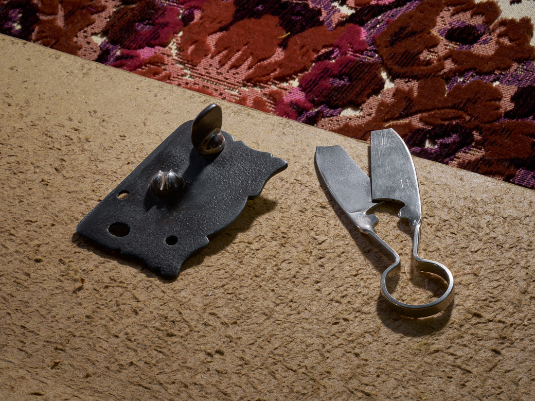 The tool holds the blade with which the weft threads are cut once they have been threaded: the blade is slid along the cutting iron rods. In the past, razors were used as blades because they needed to be very sharp. To replace the blade, the tool is opened with a special key.