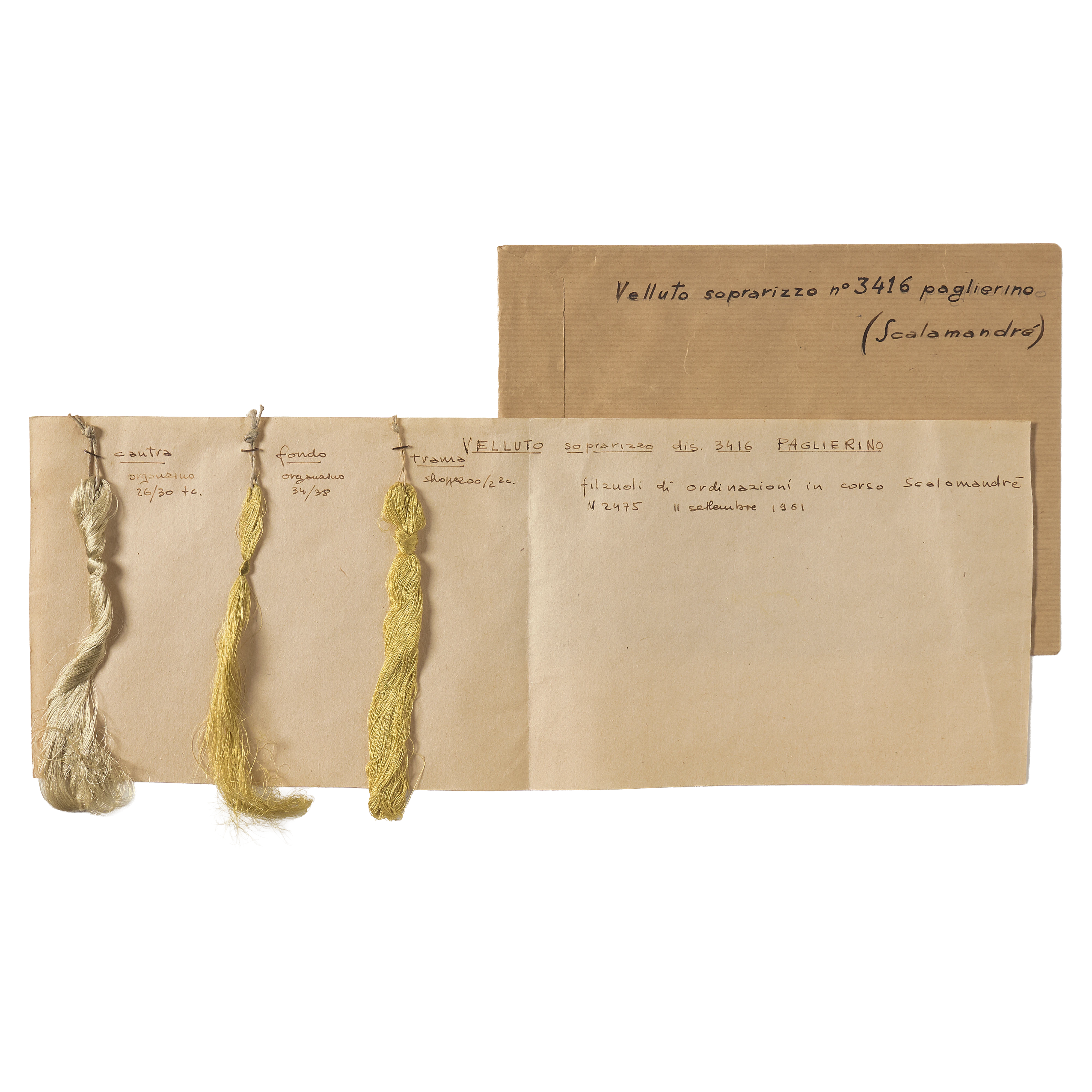 This velvet, in the red-yellow variant, was used to decorate the altar of the church of Sant’Alvise in Venice during the most important festivities. Evidence of this is the order of approximately 60 meters of soprarizzo in red/yellow tones, placed on August 20, 1941. [Source: Historical Archive section 1905-1945, correspondence, letter 4182bis. See Doretta Davanzo Poli, Il genio della tradizione, p.102]. An order from Scalamadré in 1961 also attests to its presence on the US market. [Source: Historical Archive section 1946-1988, technical archive, no. 816/54]