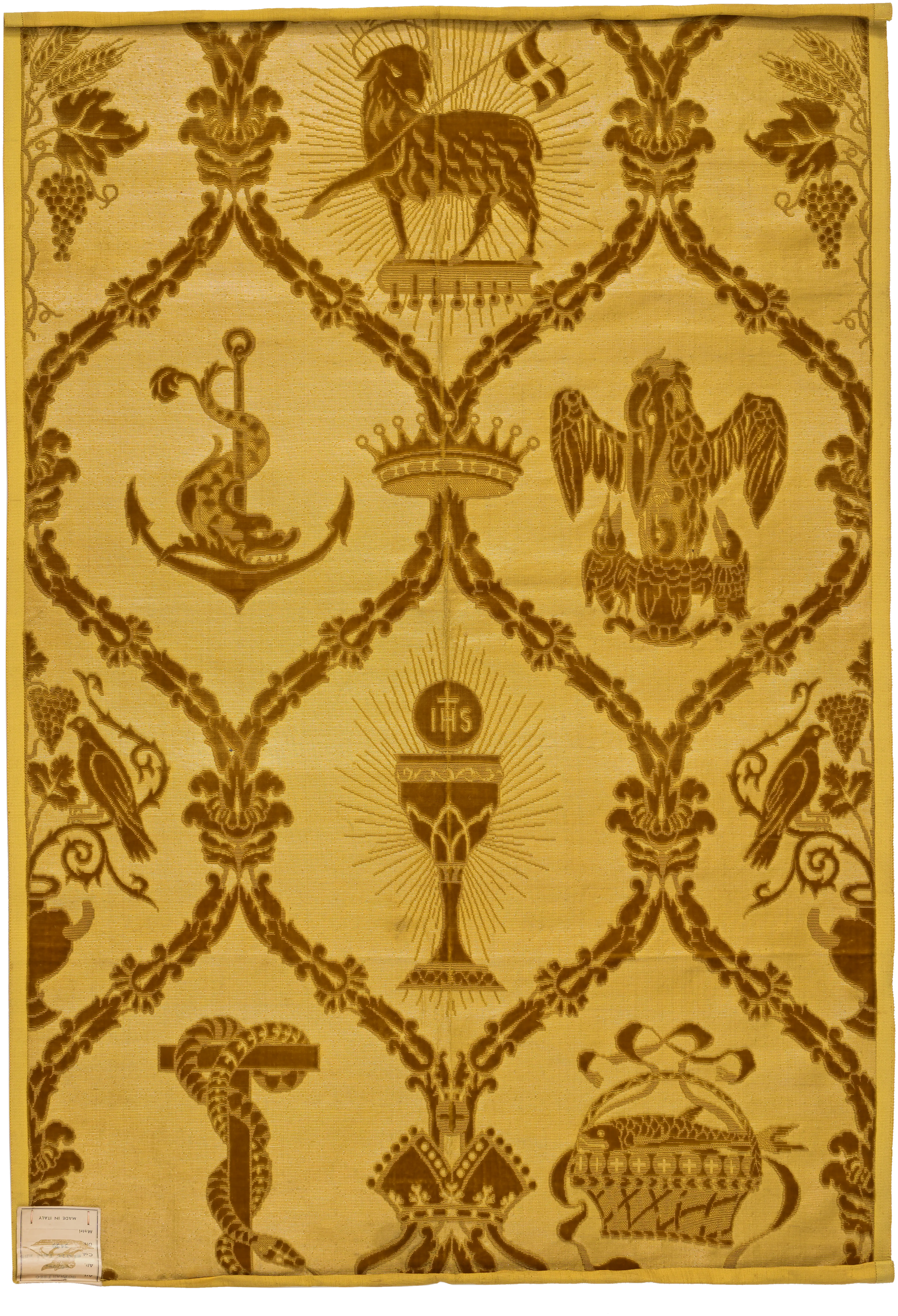 The historical name of this velvet refers to the Abbey of Praglia, whose coat of arms, the seven-pointed star, is recognizable in the decorative system. An example of the fabric was sent in 1934 to the International Exhibition of Sacred Art in Rome. [See Doretta Davanzo Poli, Il genio della tradizione, p.82]