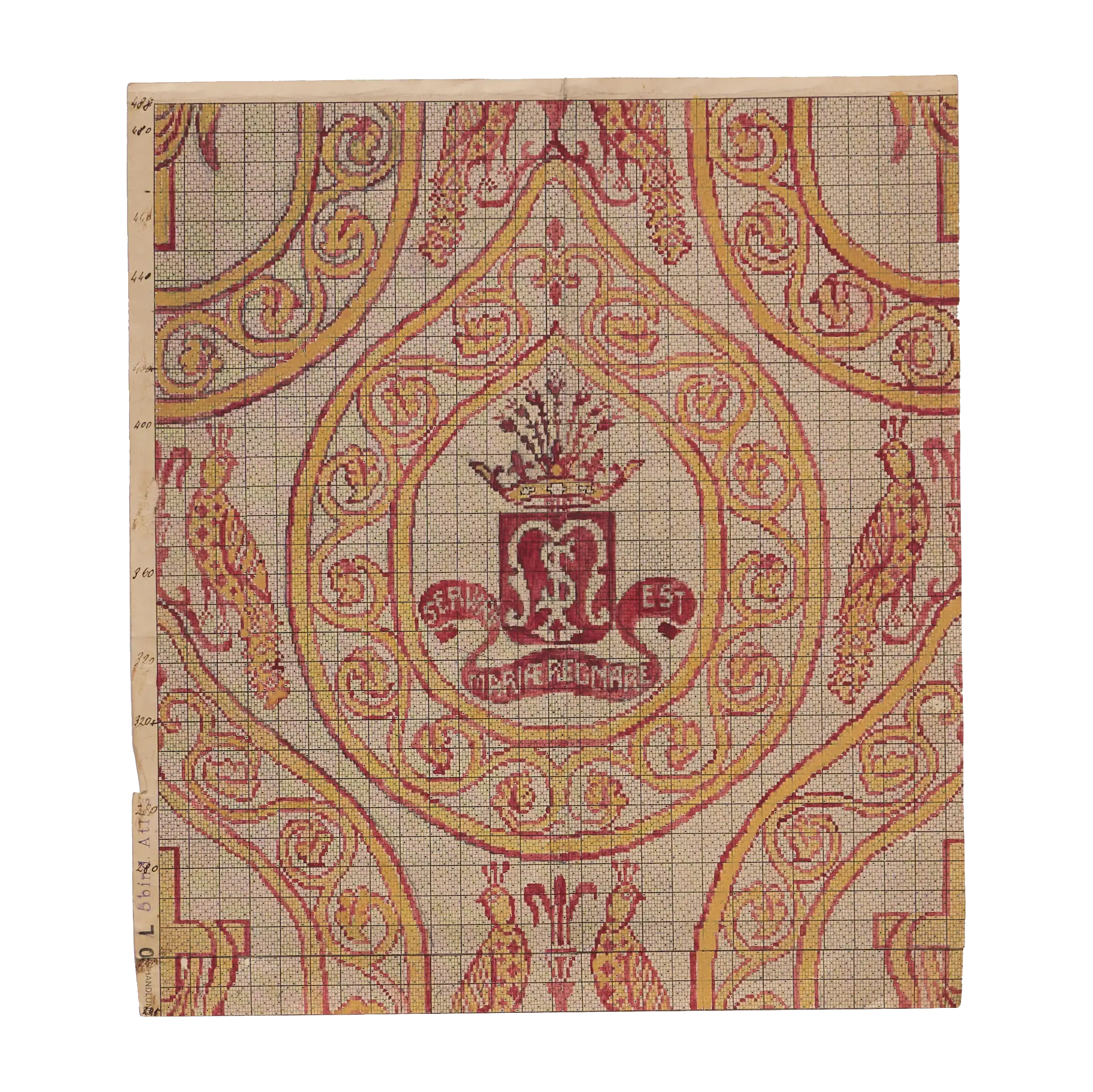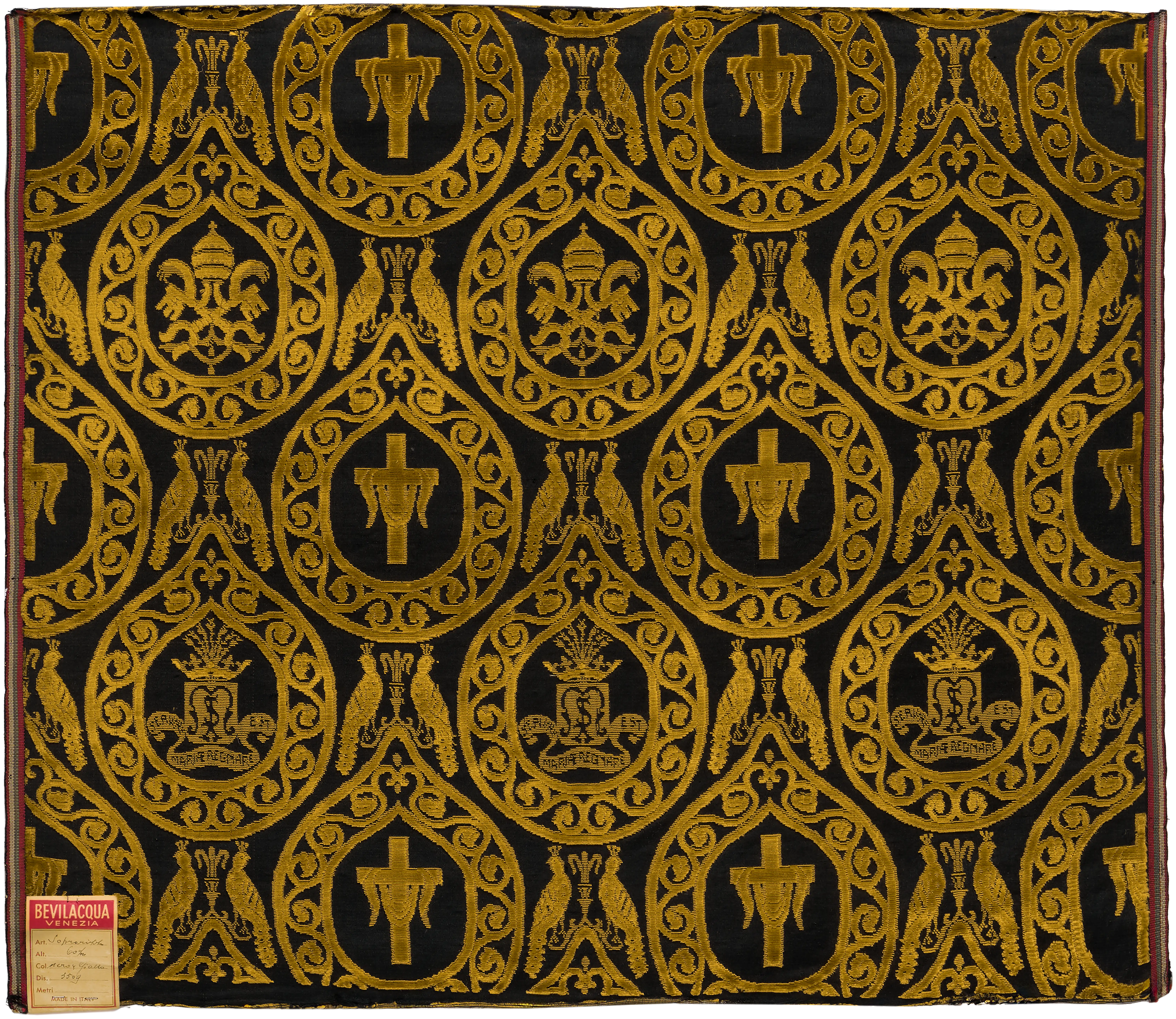 The historical name of this soprarizzo velvet would seem to refer to the church of S. Carlo al Corso in Milan, and the decorative layout suggests that the design was conceived having in mind the Order of the Servants of Mary which works in that church. The weaving drafts preserved in the archives testify that the coat of arms present in the design was conceived as a separate and removable element.